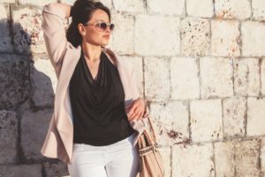 - Young stylish woman wearing neutral blazer, sunglasses and handbag walking on the city street in spring. Casual fashion, elegant look. Plus size model.