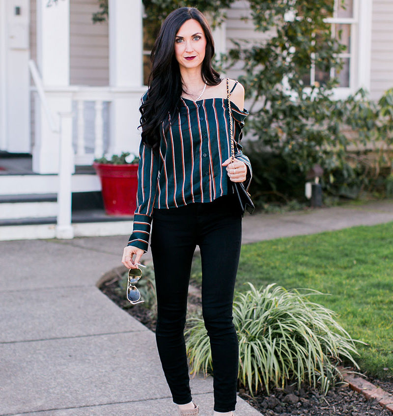 One-Shoulder Striped Shirt + Black Skinnies